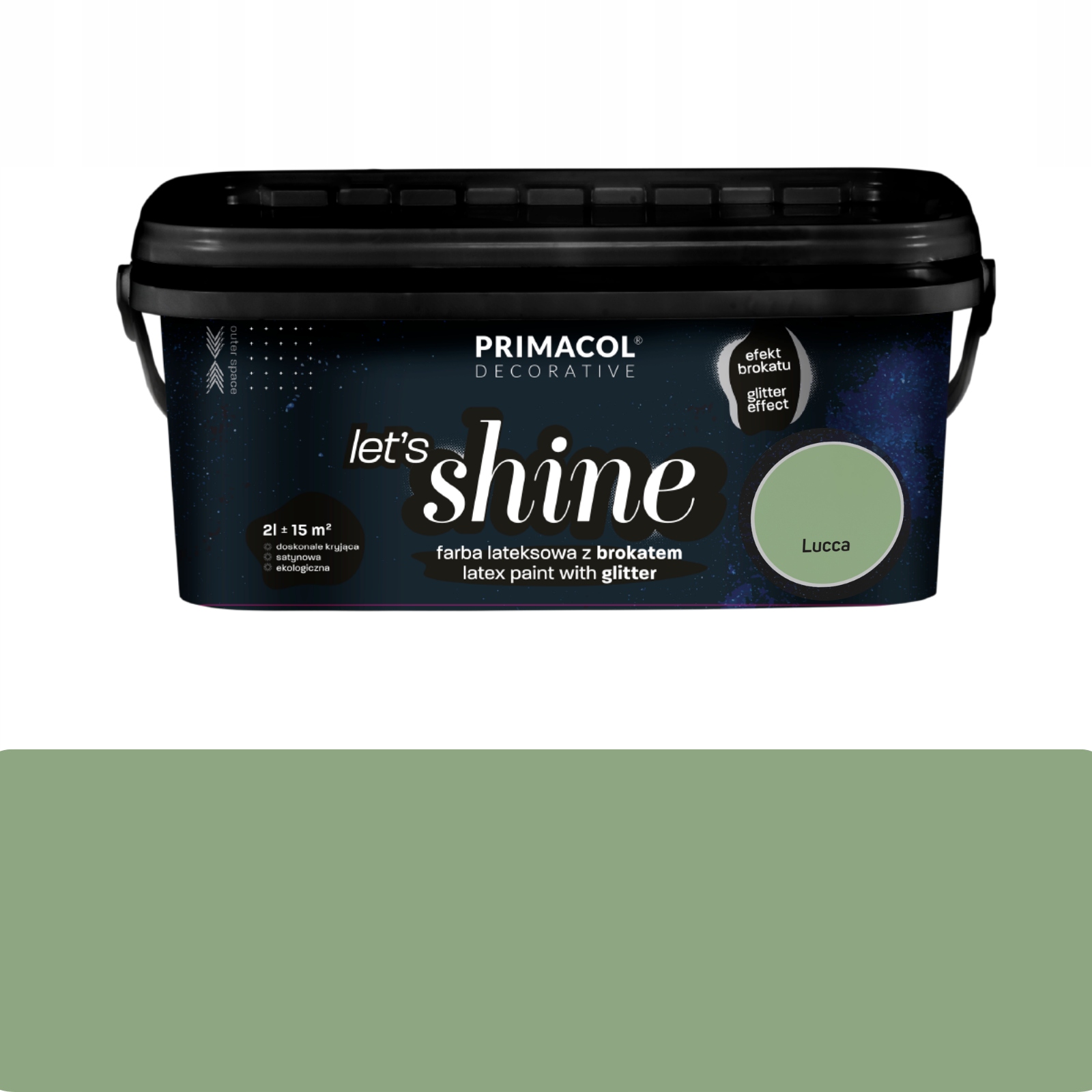 LET’S SHINE od Primacol Decorative® to markowa farba dekoracyjna, która pozwala stworzyć niepowtarzalny efekt połysku dzięki tysiącom drobinek brokatu zatopionych w satynowej powłoce. Efekt jest subtelny i szlachetny za dnia, a przy sztucznym oświetleniu nabiera wyjątkowej intensywności, nadając wnętrzu atmosferę glamour i luksusu.